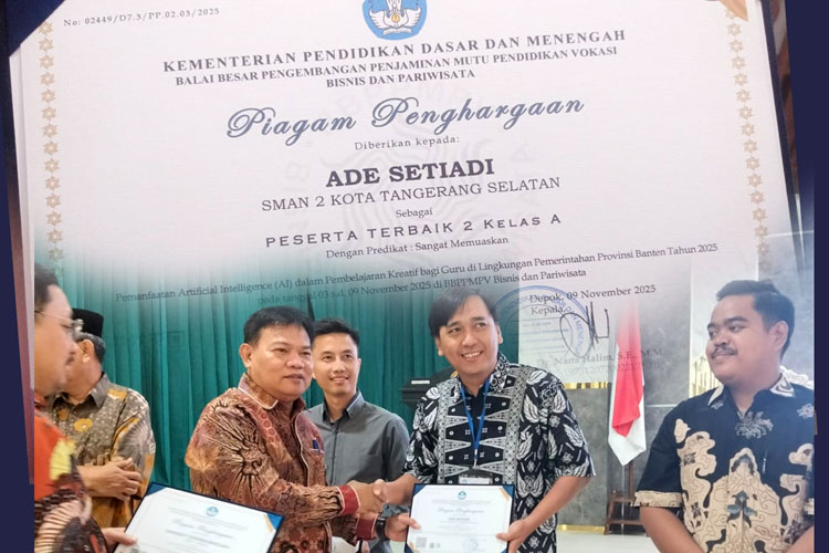 Ade Setiadi, S.Pd, telah berhasil meraih predikat terbaik 2 dalam Pelatihan pemanfaatan Artificial Intelligence (AI) dalam pembelajaran kreatif bagi guru di lingkungan Pemerintah Provinsi Banten. Kegiatan pelatihan yang akan dilaksanakan dari 2 hingga 8 November 2025 tersebut bertujuan untuk meningkatkan kompetensi dan kreativitas guru dalam menggunakan teknologi AI untuk mendukung proses pembelajaran yang inovatif dan relevan. Pelatihan ini diharapkan dapat membekali guru dengan keterampilan praktis serta membentuk jejaring komunitas guru kreatif.